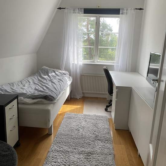 Rooms in a villa on the upper floor. The entire floor is for rent (3 bedrooms, bathroom and living room), alternatively the rooms can be rented individually. Large shared kitchen. Access to a separate building with a sauna, shower and workshop. 1 minute to the Näset bus stop, where buses run frequently to Slussen. Service fee for tenant: 627