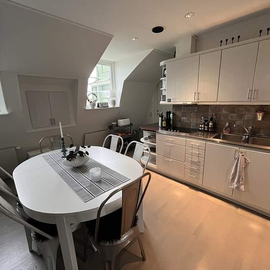 Fyra vid Eskilsparken Vindsvåning i vita huset vid Eskilsparken, 140 kvm, 4 rok (3 sovrum) Mycket fin lägenhet i bästa läge. Stort vardagsrum med balkong mot Eskilsparken och öppen spis. Två helkaklade badrum. Ena med badkar och dusch, andra med dusch. Lägenheten har egen tvättmaskin och torktumlare (tvättstuga finns också) I köket finns induktionshäll, varmluftsugn, micro och diskmaskin. Till lägenheten finns ett extra, mindre förråd på samma våningsplan utrustat med ett extra frysskåp.