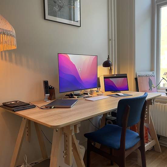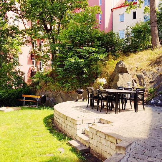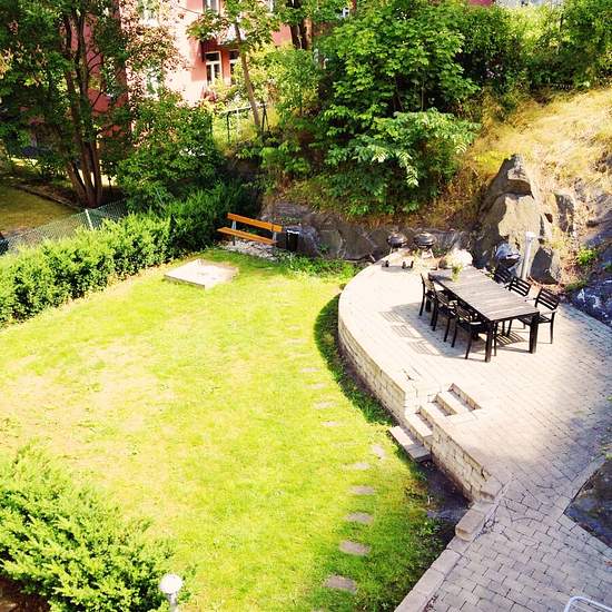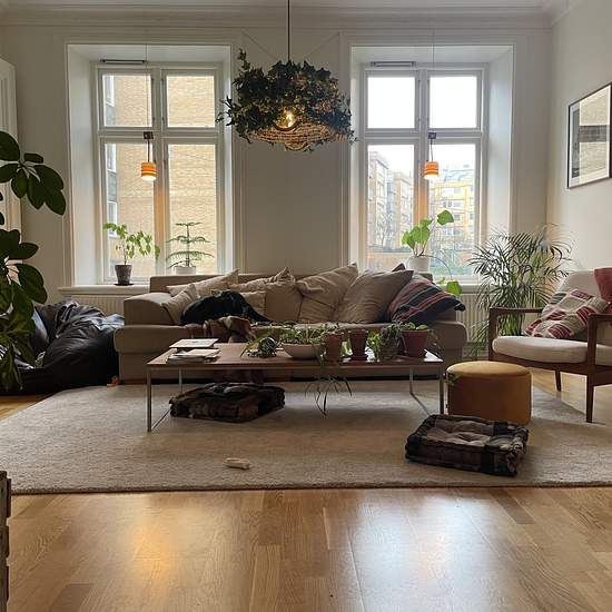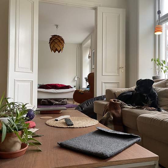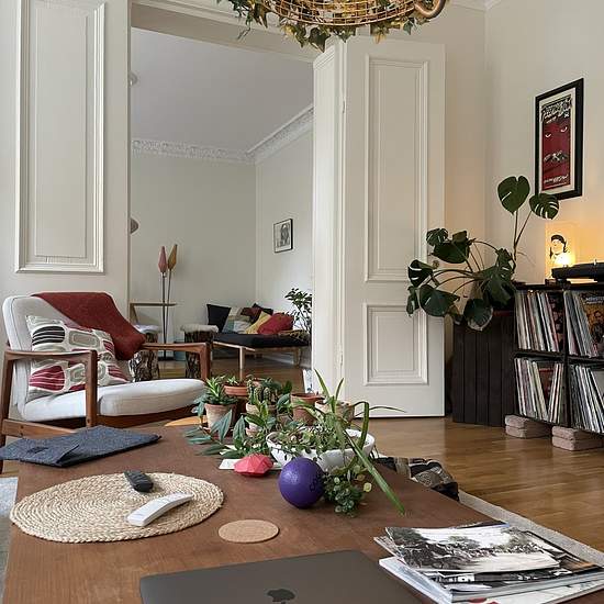 Central rental apartment, 4 rooms and kitchen, 105 sqm, second floor. 3 m ceiling height, stucco mouldings and large windows with lots of natural light. Quiet area with access to a communal courtyard with a barbecue area. The apartment consists of two bedrooms, a living room, a dining room with a desk and daybed, two bathrooms, a hallway with wardrobes and a kitchen. The larger bedroom has its own bathroom and a walk-in closet; this room is in line with the living room and dining room, with large mirrored doors between the rooms. The second...