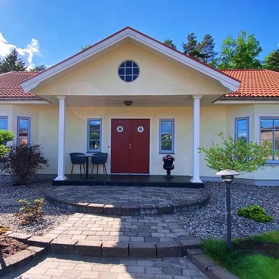 Architect-designed house, garden with a pool and double garage on a quiet street. Close to nature with the forest as a neighbor, beautiful surroundings with water and canal locks. Recreation center with lit trails, skiing both downhill and cross-country. Child-friendly with preschool and schools around the corner. Grocery stores, pharmacy, Systembolaget (the state alcohol retailer), ice rink, tennis hall, golf courses, hotel with a spa, home furnishings — and everything for your garden. Living room and kitchen with a large open-plan layout ...