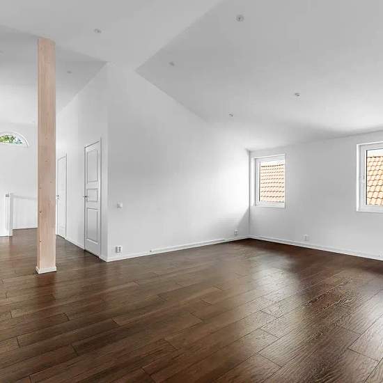 Large and spacious apartment with very high ceilings close to 4 m. Something a little out of the ordinary in the peaceful Ormbacka garden city. Lots of natural light, well insulated and ventilated with filtered supply and exhaust air. 3 bedrooms and a large living room. Smaller kitchen, more like a large kitchenette. Laundry room and entrance on the ground floor. Large staircase to the upper floor. Good parking on the property and the option to rent a 120 m2 garage with office, toilet and kitchen on the ground floor. Ground-source heating wi...