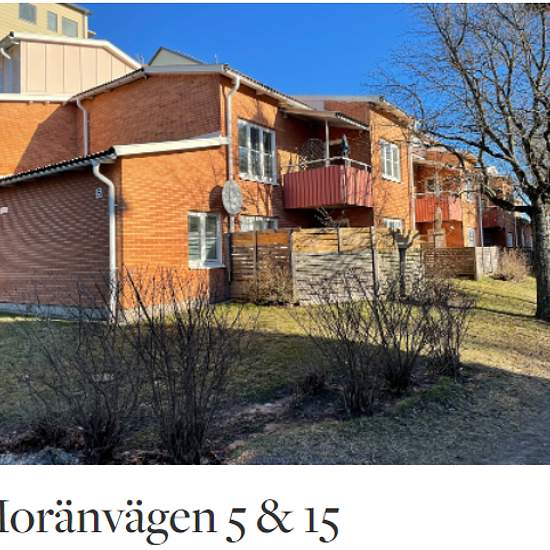 Moränvägen 5 & 15 consist of 2 houses with 2 floors and no elevator. They were built during the 1980s–1990s. Open fiber and Internet/TV subscriptions via Zmarket. Tenants arrange their own electricity contracts with Vattenfall. Cold and hot water are included in the rent. Washing machine and tumble dryer are included. Storage is included and is located on the respective walkway. A stroller room is located adjacent to the inner courtyard. Bicycle storage is located adjacent to the inner courtyard. Household waste bins are located by the yard...