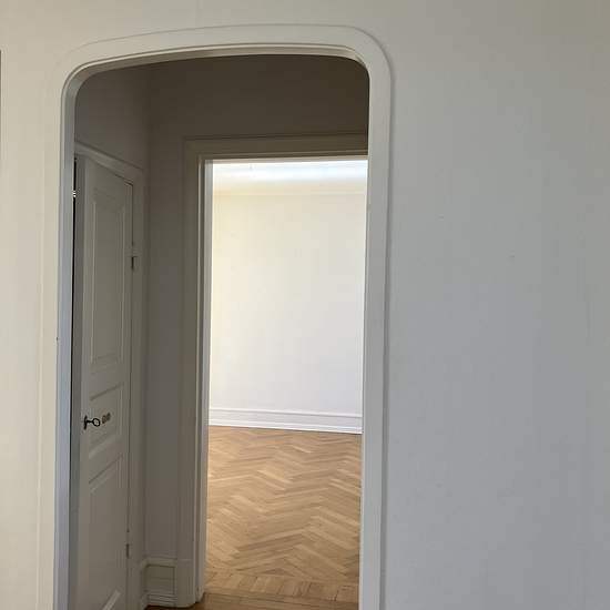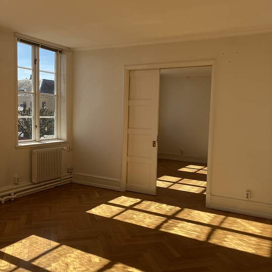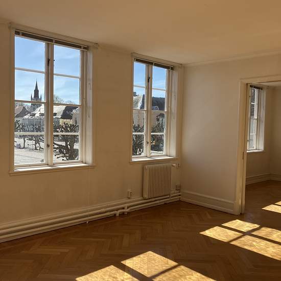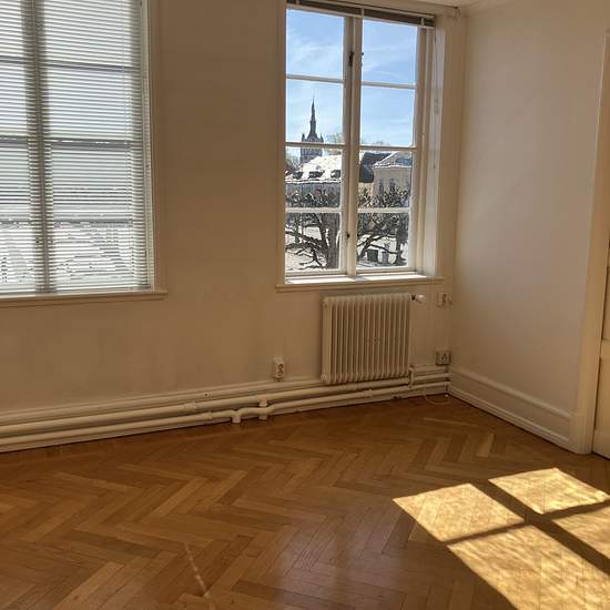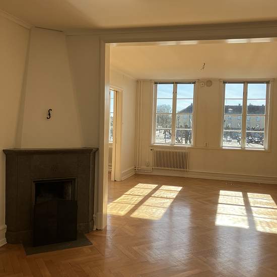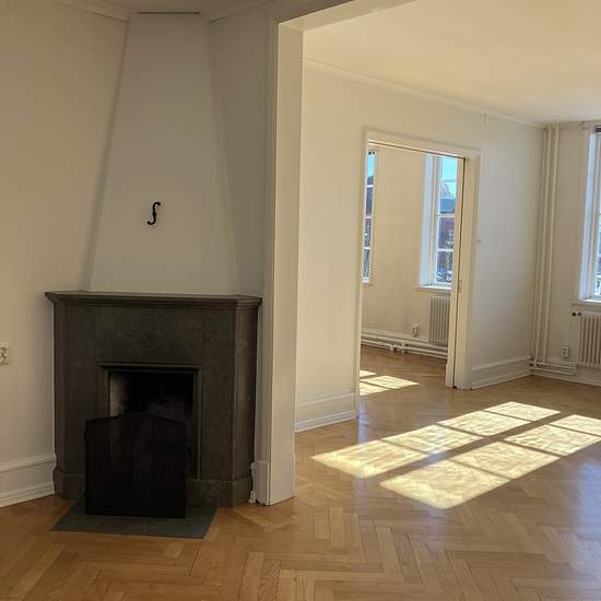 On the second floor of an old, distinguished building at New Town Square is this four-room apartment of 127 sq m. Living room and dining room in a row facing the square. Herringbone parquet flooring. Open fireplace in the dining room. One bedroom with an ensuite bathroom. Fresh, modern but slightly old-fashioned in style, including glass-fronted cabinets and beadboard in the kitchen. Located right at New Town Square. Service charge for tenant: 708