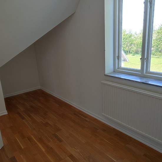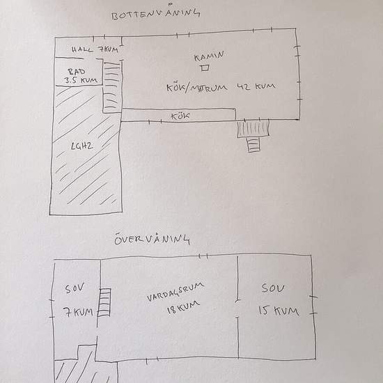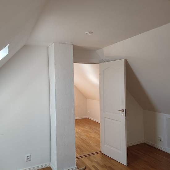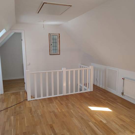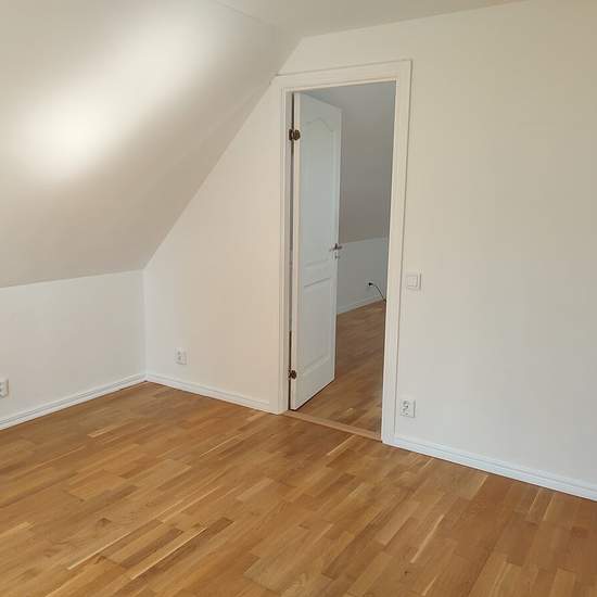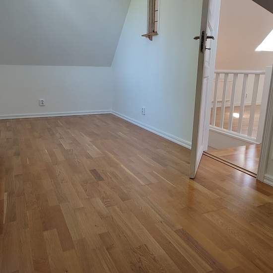 Apartment in a house with two apartments. The available apartment is on two levels in its own wing of the house. An elderly couple from Lithuania lives in the other apartment. Private entrance and two private parking spaces. On the ground floor there is a large living area with a kitchen, bathroom and a small storage room. On the upper floor a living area/bedroom with a master bedroom at one end and a smaller bedroom at the other end. Service fee for tenant: 643