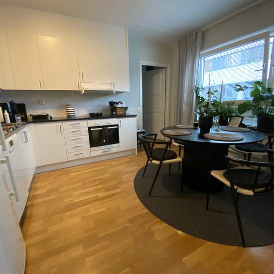 Nice and fresh four-room apartment in a perfect location! You'll be close to the city center while also having easy access to the lovely walking paths along the stream. There is a garage in the building available to rent subject to availability. The rent includes a dishwasher, a washing machine and a tumble dryer. Please submit your application!
