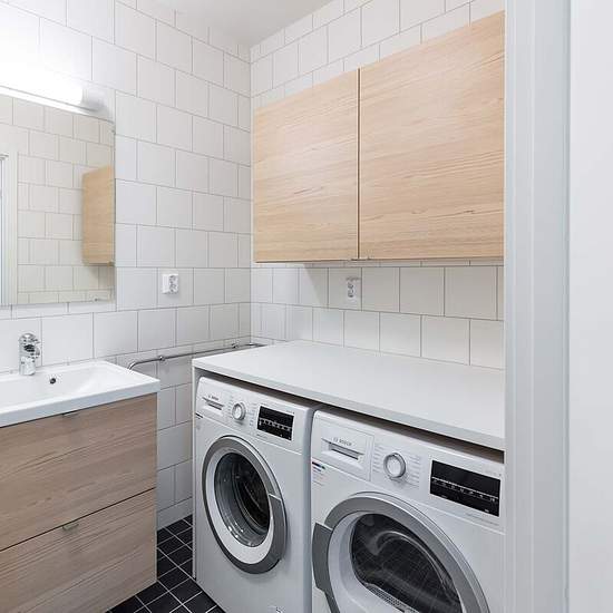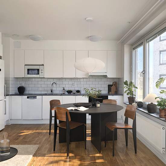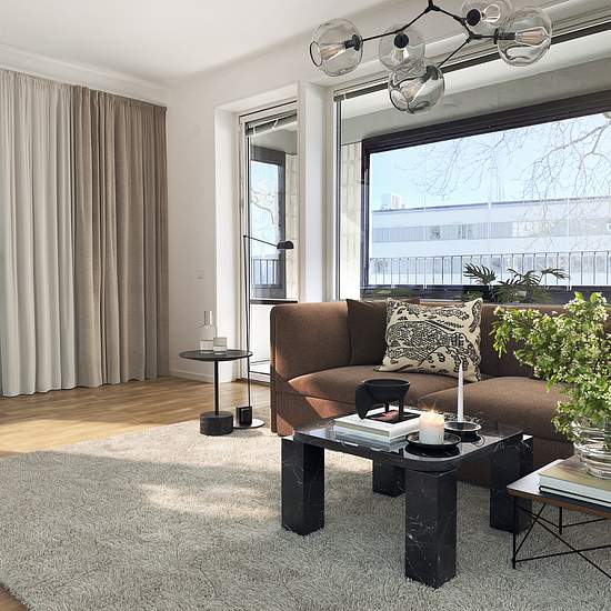 The furnished interior images in the listing are digitally styled example images; the remaining images are examples from a similar apartment. Four-room apartment of high standard in a top location Welcome to this well-planned four-room apartment of 90 m² on the 4th floor with a glazed balcony. It suits a small family with children or perhaps those of you who work a lot from home and need separate offices. You get a well-equipped kitchen with fridge, freezer, dishwasher, hob, built-in oven and microwave. Living room adjacent to the kitchen. ...