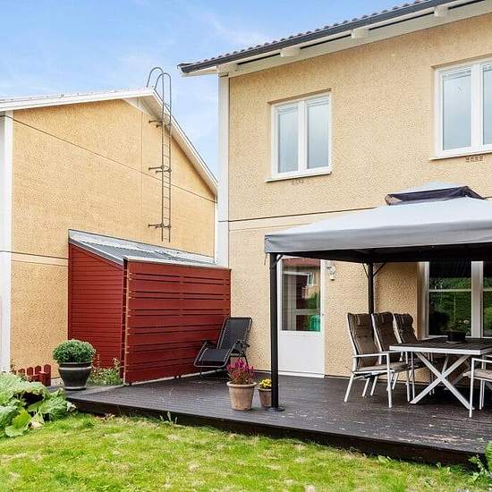 Nice condominium on two levels with a private entrance. Outdoor spaces at both the front and the back. Three bedrooms on the upper floor as well as a smaller bedroom furnished on the lower floor. Large walk-in closet on the upper floor. The rent includes TV/internet, one parking space, and heating. Household electricity of about 500 per month is added, depending on electricity usage. There is a kitchen table with chairs and a sofa in the living room. The upper floor is unfurnished. Service fee for tenant: 922