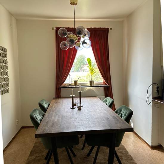 Rymlig och stor 4:a (ca 100 kvm) med toalett och badrum. Diskmaskin och tvättförråd i lägenheten. Matrum intill kök. Stort vardagsrum och L-formad hall.
