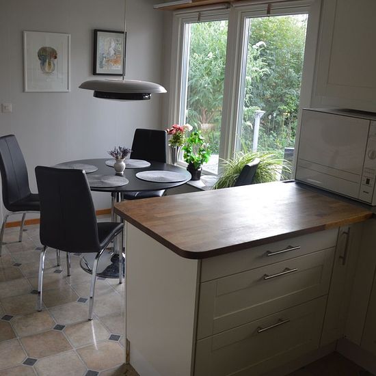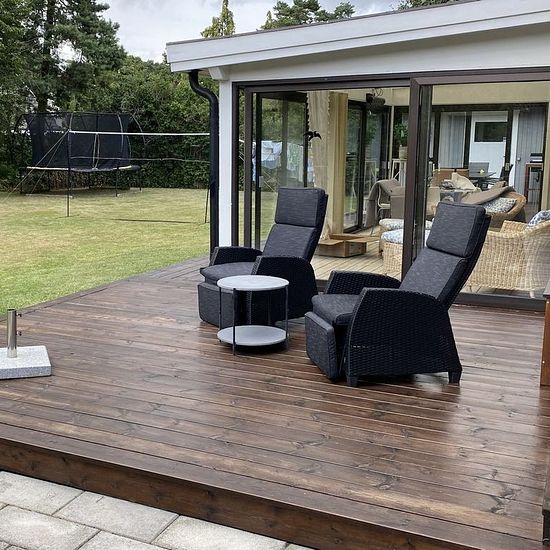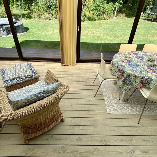 Practical and well-planned single-story villa (121 sqm) with a privacy-shielded garden, conservatory (23 sqm), and two outdoor patios. Located in a very quiet residential area. 2 km from the sea – you can bike there (paved bike path) in 6-7 minutes. Both the villa and the garden have undergone a number of improvements and renovations in recent years – including a complete window replacement. Parking space for two cars. Heating: direct electric heating, stove, and air heat pump (also can be used for AC/cooling). Some costs are included i...