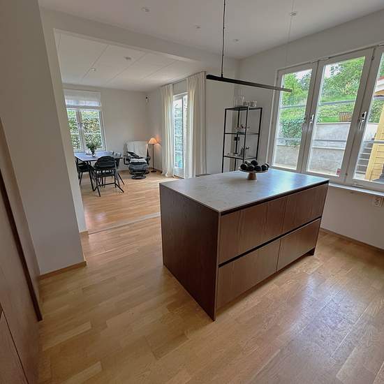 Newly renovated semi-detached house with a villa-like feel near Edsviken Welcome to this lovely semi-detached house that underwent extensive renovations to both the kitchen and bathroom in 2024/2025, and received a completely new patio with decking and lawn. Here modern design and high quality meet a genuine single-family home feel and a nature-close location. Entrance level The home's social areas are gathered on the entrance floor. The spacious living room is bathed in light thanks to windows facing multiple directions. Adjacent is the n...