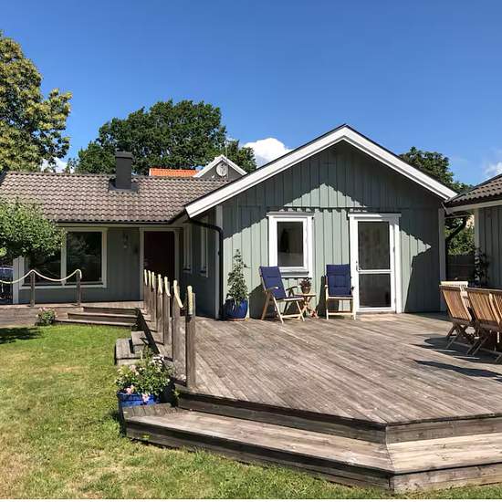 Good location, large and low-maintenance plot, lovely outdoor terraces on several sides Three bedrooms, one with a double bed and two with bunk beds. Bathroom, kitchen with a seating area, and a living room. Easy access to grocery store, bus stop, etc. Broadband, new smart TV, Verisure (alarm) Grill, bicycles, etc. are available to borrow if desired The house is furnished. Electricity is additional. Service fee for tenant: 643