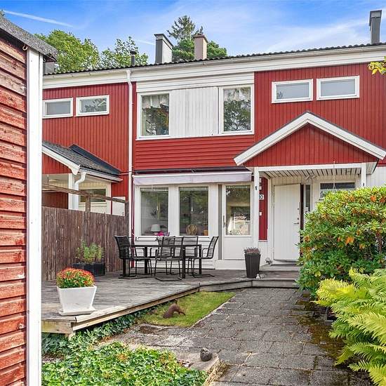 Välplanerat radhus i två plan – med naturnära läge, dubbla uteplatser och garage Välkommen till detta charmiga radhus i två plan, beläget i ett trivsamt och lugnt område, perfekt för familjen som söker både ro och närhet till naturen. Här erbjuds ett hem med genomgående fina ytskikt och golv, en braskamin för mysfaktor, och en öppen planlösning som skapar en luftig känsla. På entréplanet finner du ett stilrent kök och ett rymligt vardagsrum med öppen planlösning mot matplatsen. Här finns gott om plats för både vardagsliv och sociala sammanko...