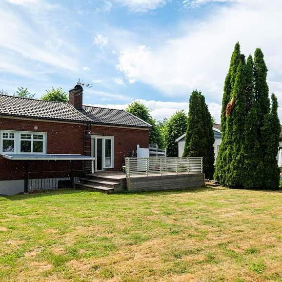 Here you will find a total area of 130 sqm to enjoy with many possibilities. Living area 65 sqm and secondary area 65 sqm. The home's entrance level features a kitchen with a dining area in the adjoining room, a living room, a bedroom and a renovated WC. In the basement there is a bathroom, a bedroom and a laundry area with a washing machine and tumble dryer. The basement also has an additional larger room that can be used as a bedroom for those who need it. The house is very energy-efficient. Outside the house there is a driveway with pa...