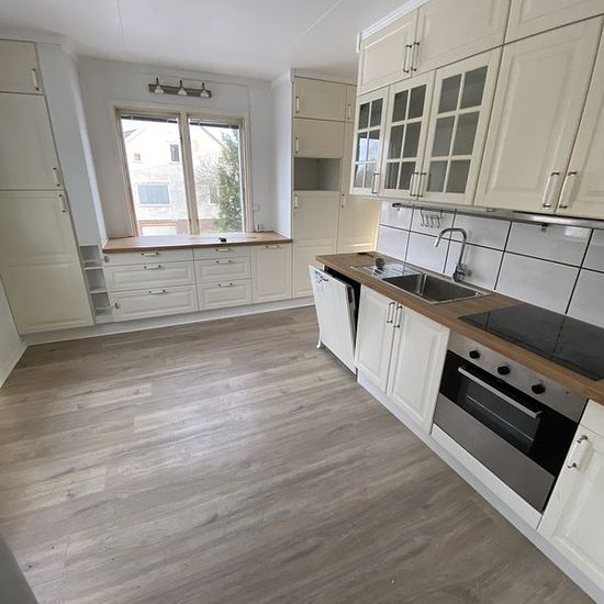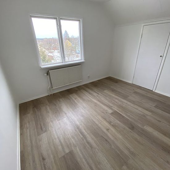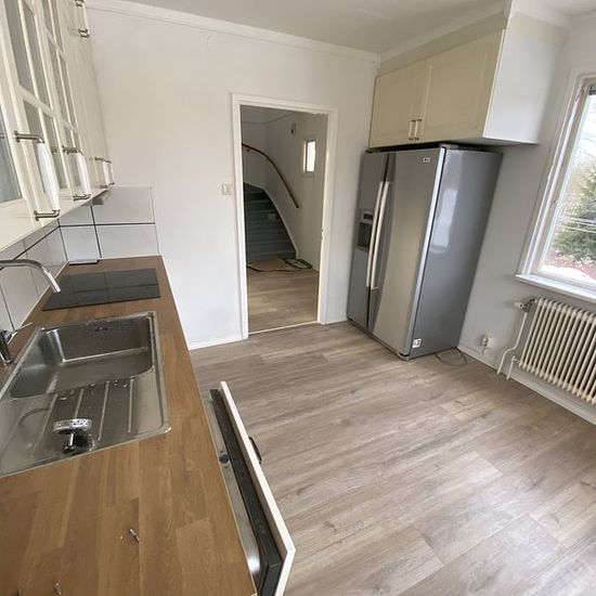 Beautifully renovated house, quiet residential area, with 3 bedrooms, kitchen, bathroom, living room with built-in fireplace with wood. New triple-glazed PVC windows. Cold rent 7000 SEK, Heating electric boiler Service fee for tenant: 351