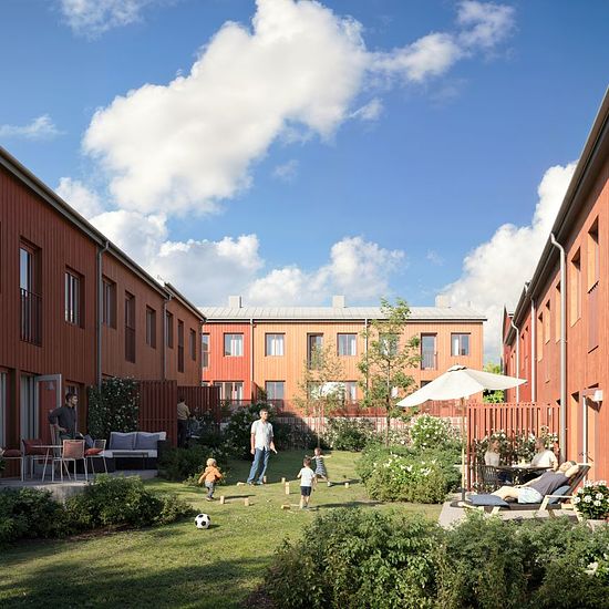 Välkommen till ett nybyggt radhus i två plan med genomtänkta materialval och en harmonisk färgskala. Väggarna är målade i en varm sandbeige ton som passar väl ihop med det ljusa ekparkettgolvet och köket från Marbodal i liknande nyanser. I hallen möts parkett och grå klinker. På entréplan finns golvvärme, medan övre plan värms med radiatorer. Köket är utrustat med moderna vitvaror och har vitt kakel som stänkskydd, vilket ger ett stilrent uttryck. Vardagsrummet erbjuder plats för både soffgrupp och matbord och har dessutom utgång till en ste...