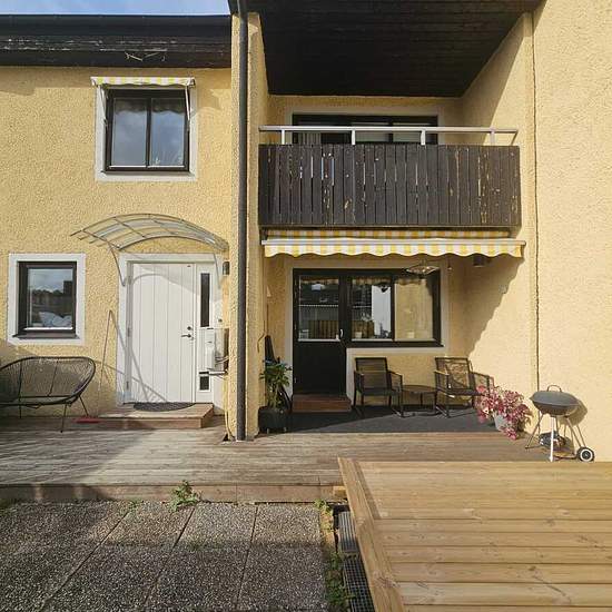 Quiet, nature-close area with a large playground right outside the house. 20-minute walk or 8 minutes by bike to Strängnäs station. Bus service is 3 minutes away. Private locked storage for bikes/strollers is on the property just outside the house. Private garage and free parking in the area. Cozy small private yard with new decking and grass at the front with barbecue possibilities. Brand new patio of approximately 50–55 m² with decking at the back. 2 bathrooms. Bedroom 1 has its own balcony and a large walk-in closet in the room. Bedroom ...