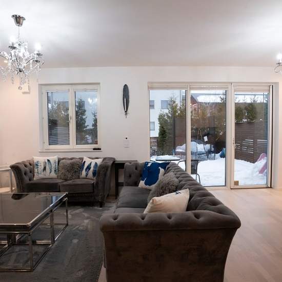 Ett radhus i Glasberga, 3 sovrum, badrum och sittgrupp/TV-hörna på första våningen, matsal/TV-rum, kök, badrum och ett litet förråd under trappan på bottenvåningen. Fullt möblerad och inflyttningsklar.