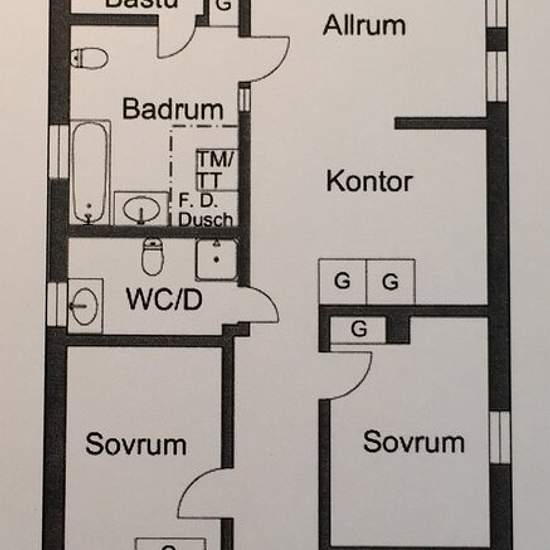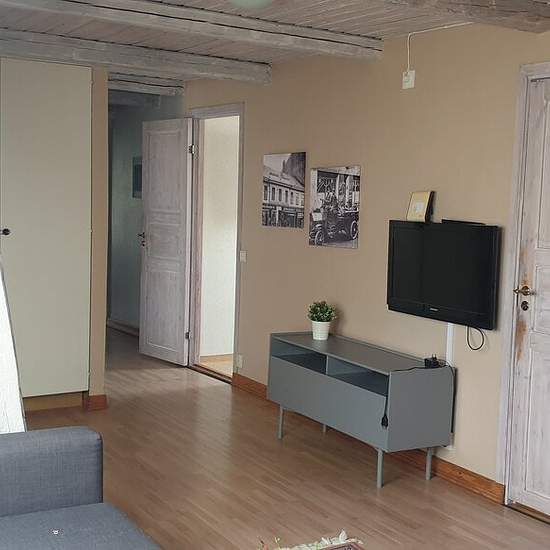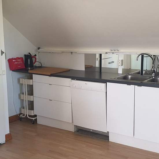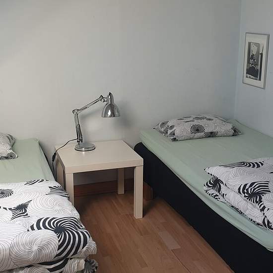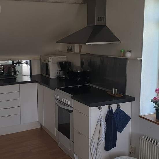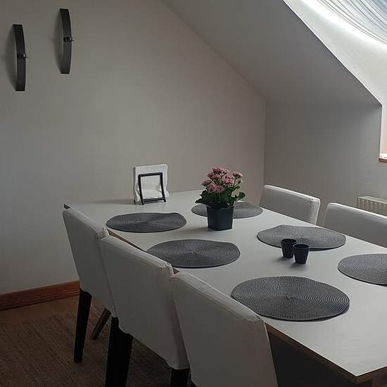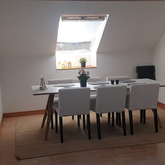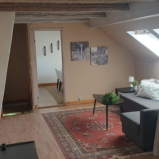 The apartment has lots of possibilities. In recent years a company has rented the flat as an overnight apartment for their employees. Today there are no fewer than 6 beds, and other furniture can remain if you want to rent it partly furnished. There is a private ground‑level entrance where you can hang up clothes and leave shoes. The whole apartment is charmingly decorated with visible ceiling and wall beams. A large modern fully equipped kitchen with an associated bright and spacious dining area with a table and a kitchen bench. Among other...