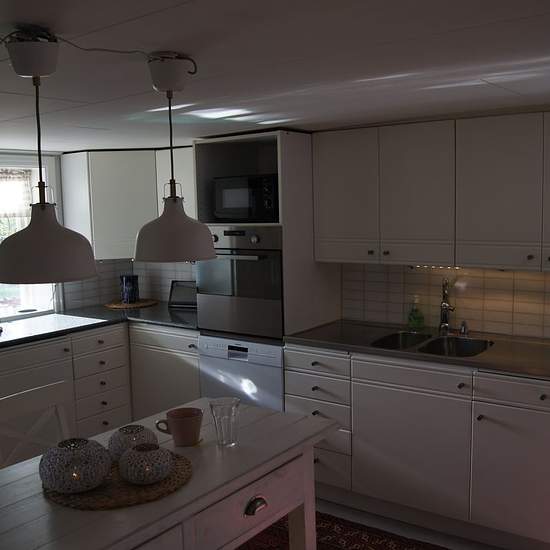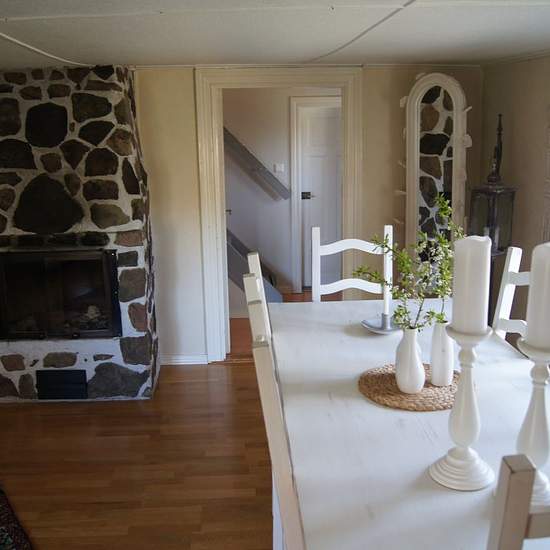 Picturesque house in the countryside, 6 km from Älmhult. The house dates from 1890, with low ceilings (195 cm). Extended in 1996 with a boiler room, larger toilet and hallway. Large plot with cherry trees, plum trees and berry bushes. Conservatory and wooden deck in the evening sun. Here you can choose to heat the house with wood or electricity. Garage and small carport are included in the rent. The lower floor consists of a boiler room, toilet with laundry area, hallway, kitchen, living room and a small bedroom. The upper floor has three b...