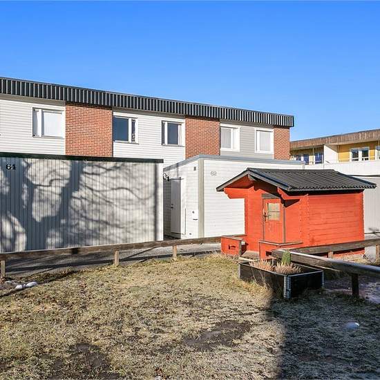 The townhouse is located in a quiet and family-friendly area. The residence is on two floors. On the ground floor there is a kitchen and a laundry room as well as a toilet on one side and a living room on the other. There are patios at both the front and the back, which provide a cozy and suitable place for barbecuing. On the upper floor there are four bedrooms and a bathroom. In addition, there is a large balcony. Garage available. There is a school nearby. Buses run frequently to the commuter train station in Kungsängen and it takes about ...