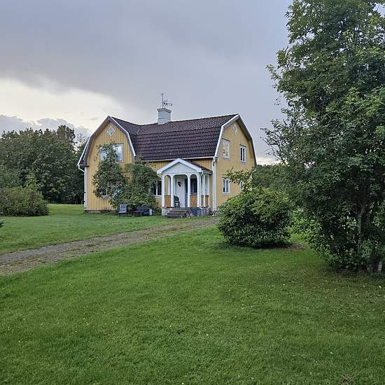 The house is heated by an energy-efficient heat pump. You can also burn wood in a wood stove and a tiled stove. There are 2 WCs and 1 walk-in closet. And for those who like to grow things there is a private greenhouse and a vegetable garden. It is a lovely garden with apples, cherries, sweet cherries, and pears. A shed for storage and for a car, and a stone-lined root cellar. Write a little about yourselves and I will get in touch. Service fee for tenant: 346
