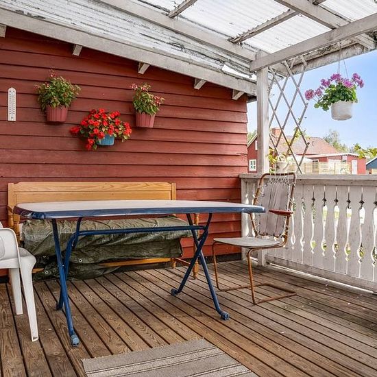 5 rooms and a basement. In the basement, there is a recreation room, boiler room, workshop, and laundry room with a bathtub and shower. The house is located in a safe and quiet area of Vedevåg with many nice neighbors. Cozy garden facing the cow pasture with many wonderful berry bushes and raised beds with strawberries and a newly painted woodshed. In Vedevåg, there is a small grocery store; the school and preschool are located further down the street. Service fee for tenant: 565