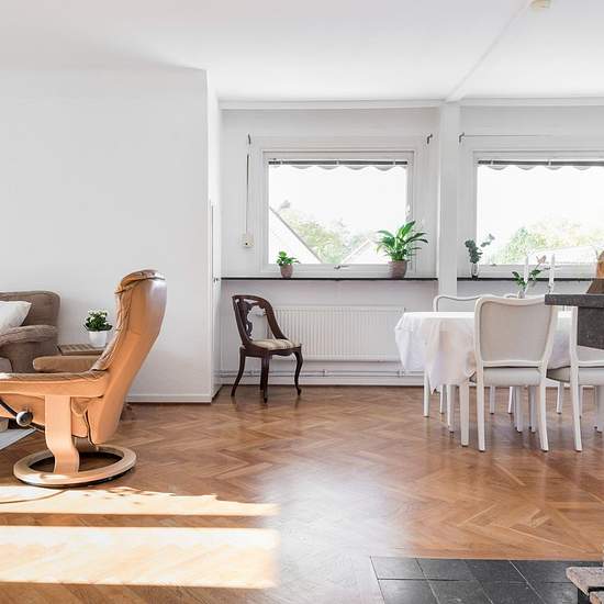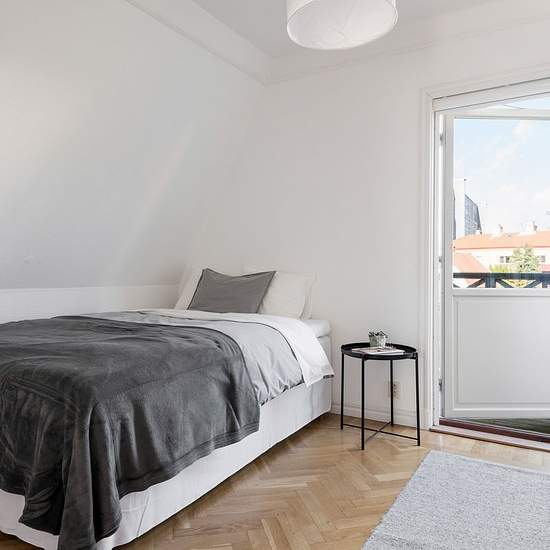 Large and bright apartment on the second floor of a two-family house. Pleasant, leafy garden with several different fruit trees, a lawn and a patio shared with the residents on the first floor. Private large balcony, approx. 15 sq.m. One of the bedrooms is located on the third floor, reached by stairs up from the living room. Newly renovated, nice bathroom. Oak parquet in all rooms. The apartment is rented on an ongoing basis. A standard credit check will be carried out before signing the lease. Suitable for a large family, housing cooperat...