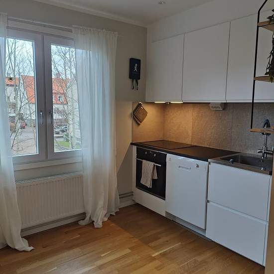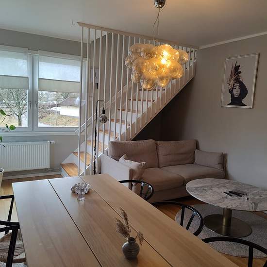 Completely renovated two-story apartment of 84 sqm. New kitchen with dishwasher. Fully tiled bathroom with underfloor heating. Balcony. Heat and water included. Electricity not included. Fiber available. Service fee for tenant: 668