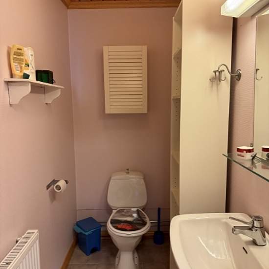 Charming turn-of-the-century house with four tiled stoves. Laundry room, sauna, toilet and shower in the annex. Shower and toilet are in the main building. Large covered terrace. Three rooms on the upper floor and three rooms and a kitchen on the lower floor.