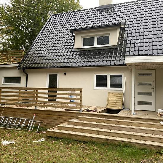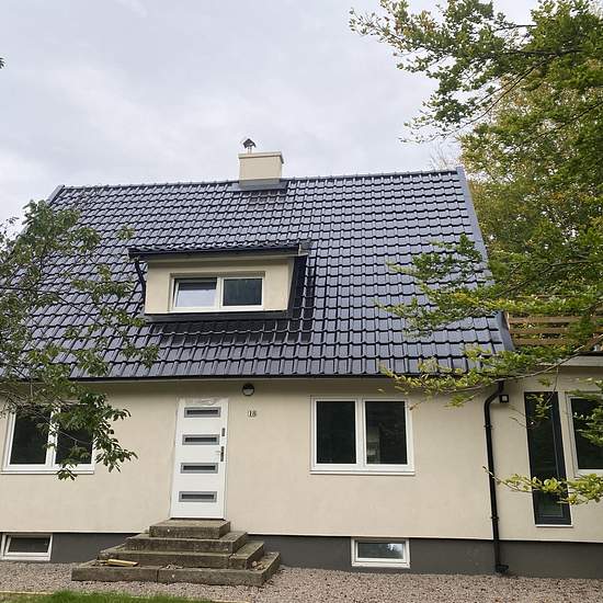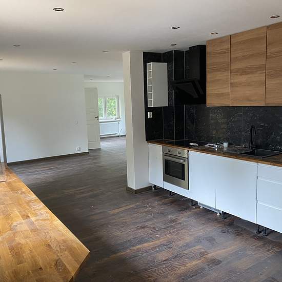 Newly renovated villa in a quiet area. 6 rooms, 2 bathrooms—one with a shower and one with a whirlpool bathtub; large kitchen with dining room. Large wooden deck on the ground floor and a big terrace on the upper floor with a view over Vittsjö campsite. Large basement under the entire house. Air-to-water system. Cold rent. Operating costs are additional: electricity, water, internet, waste collection, insurance. Large garden, approx. 1,500 m². Service fee for tenant: 495.