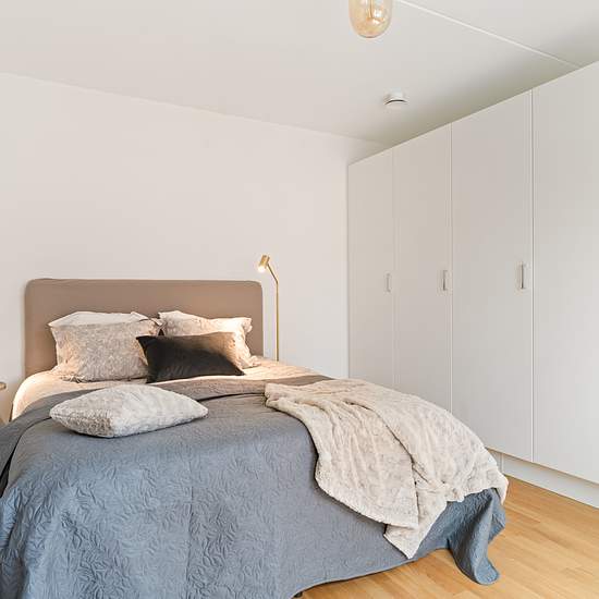 Ljusinsläpp från två väderstreck och balkong med förmiddagssol. Fönsterbänkar i natursten, vitmålade väggar och ekgolv. Vitt kök från Vedum med rostfria vitvaror från Electrolux.; diskmaskin, kyl och frys i fullhöjd, induktionshäll, varmluftsugn och mikrovågsugn. I bänkskåpen är det dämpade fullutdragslådor och ledlist under väggskåpen ger ett bra arbetsljus Badrummet är helkaklat och här finns dusch med vikbara duschväggar, handfat med vit kommod med spegelskåp ovan, toalett, tvättmaskin och torktumlare. En kommod under tvättstället gör det...