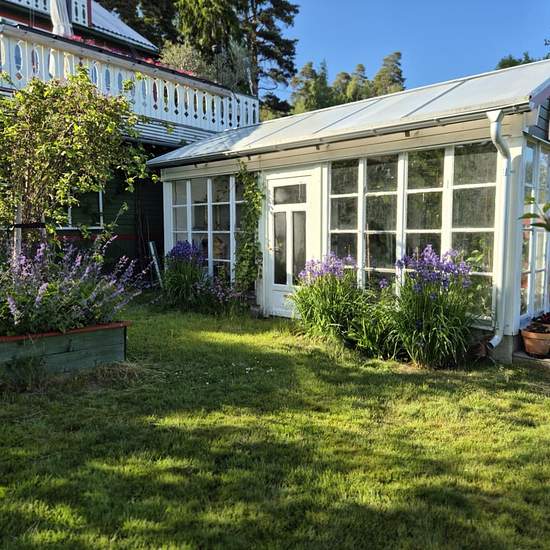 Ett fantastiskt sekelskifteshus på fin strandtomt. En stor glasveranda för middagar och umgänge. På övre våningen en mindre veranda som kan användas till sovrum eller kanske ateljè. Båda verandorna har vackra spröjsade fönster. Vardagsrum med vedkamin som värmer skönt och ger en mysbrasa. Nytt modernt kök. Stor rymlig hall. En toalett på nedervåningen och ett badrum med bastu, tvättmaskin och torktumlare på övervåningen. 3 sovrum på övervåningen. Finns även ett oinrett rum som idag används till förråd och hobbyrum. Stor altan med fantastisk ...