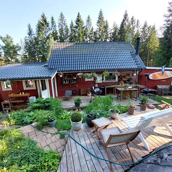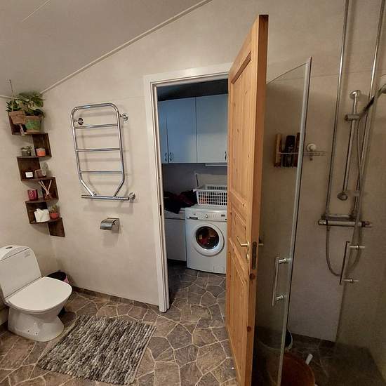 Comfortable and cozy accommodation outside town. The spruces are the neighbors. I have lived here for over 6 years and enjoy it very much. Now I'm going to Stockholm to study cultivation/gardening. My home is rented furnished. A home in the forest, with everything you need. Layout: Ground floor: Hall, bathroom 1, kitchen/dining room with access to a sunroom, living room with wood-burning stove and a bed, master bedroom, bathroom 2 with laundry room. Upper floor: Guest room with 2 beds and a living room. Guest cottage with 2 beds, loft with ...