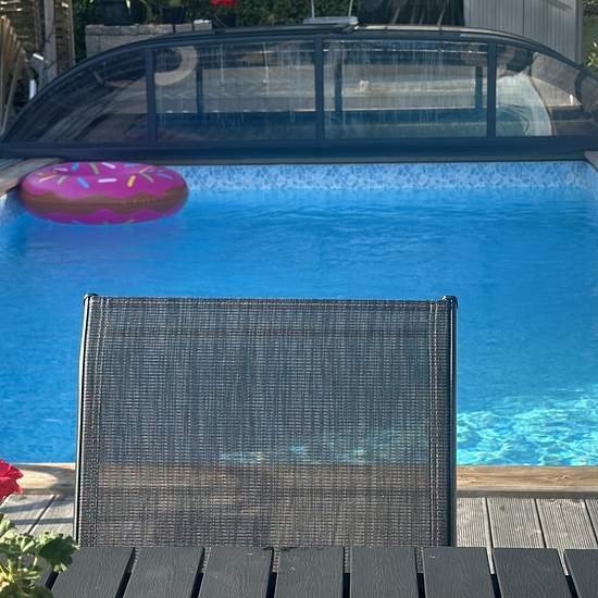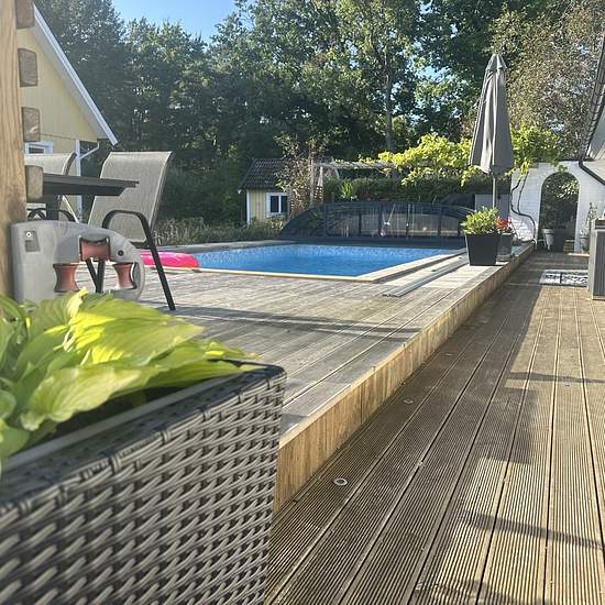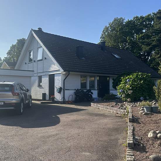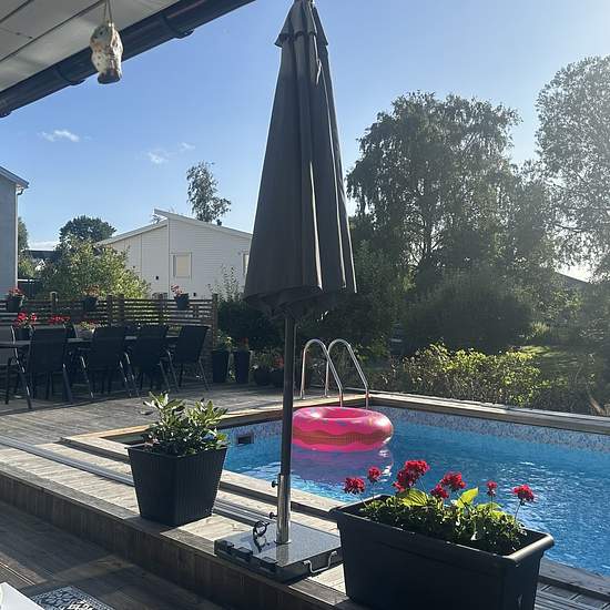 Trivsamt fristående hus på 1.5 plan i ett barnvänligt och lugnt villaområde. Huset har 4 sovrum, 2 klädkammare, stort och ljust allrum på övervåningen och toa/badrum med bubbelkar. På nedre våningen välkomnas man av en rymlig och ljus hall med garderober och stora skoskåp med hyllor. Här finns toa/dusch, ett stort fullt utrustat kök, tvättstuga samt öppna ytor som vardagsrum, TV-rum och sällskapsrum med bar. Vardagsrummet har öppen spis och stora fönsterpartier mot den trivsamma altanen som omger en 4x8m pool. Poolen är utrustad med värmepum...