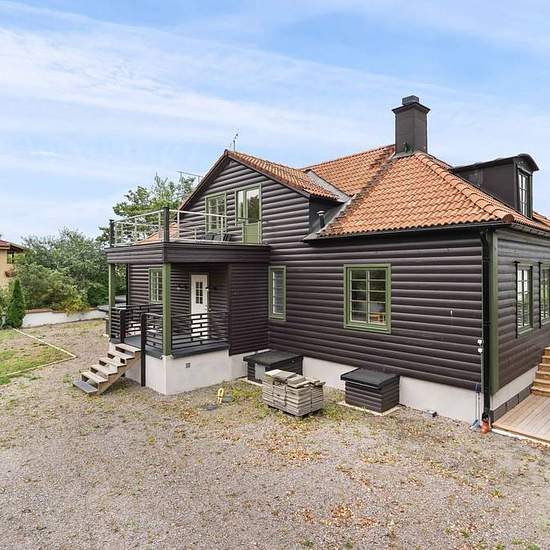 Unik villa i två våningar byggd 1930 i nationalromantisk stil med valmat tak, svartbrun liggande stockpanel och gröna fönsterbågar. Samtliga ytskikt utom kök och badrum samt alla fönster är renoverade 2023-2024. Kök och badrum renoverades 2008. Känslan när man kommer in i huset är att man är i en paradvåning. Stora rum i fil med fiskbensparkett med utgång till en balkong som sträcker sig efter hela södra fasaden. På baksidan finns en insynsskyddad trädgård med ett stort trädäck. I villans källar/souterängvåning ligger en helt nyrenoverad res...