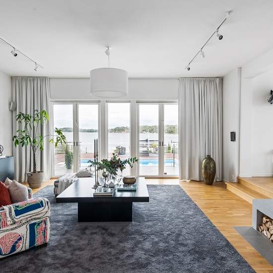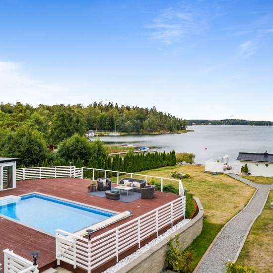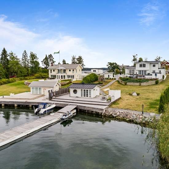 Beläget intill vattnet på en udde och vid återvändsgata ligger denna välbyggda villa på strandtomt i optimalt solläge (sydväst) och härligt ljus pa stora uteplatser och vid poolen samt kvällssol till ca kl 21 på sommaren. Huset ar väldigt genomtänkt bl.a. med mycket inbyggd förvaring. Läcker design med nivåskillnader, högt i tak, stora glaspartier mot vattnet, golvvärme i hela huset på alla tre plan samt två eldstäder. Dubbelgarage med elportar, fullinrett gym, gästhus vid vattnet, egen hamn och brygga. Stora sociala ytor inom- och utomhus g...