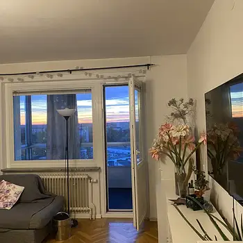 Mycket natur runt omkring även om läget nära vägen kan upplevas som störande beroende på var du bor. Nära till Hökarängsbadet ungefär 5 min promenad